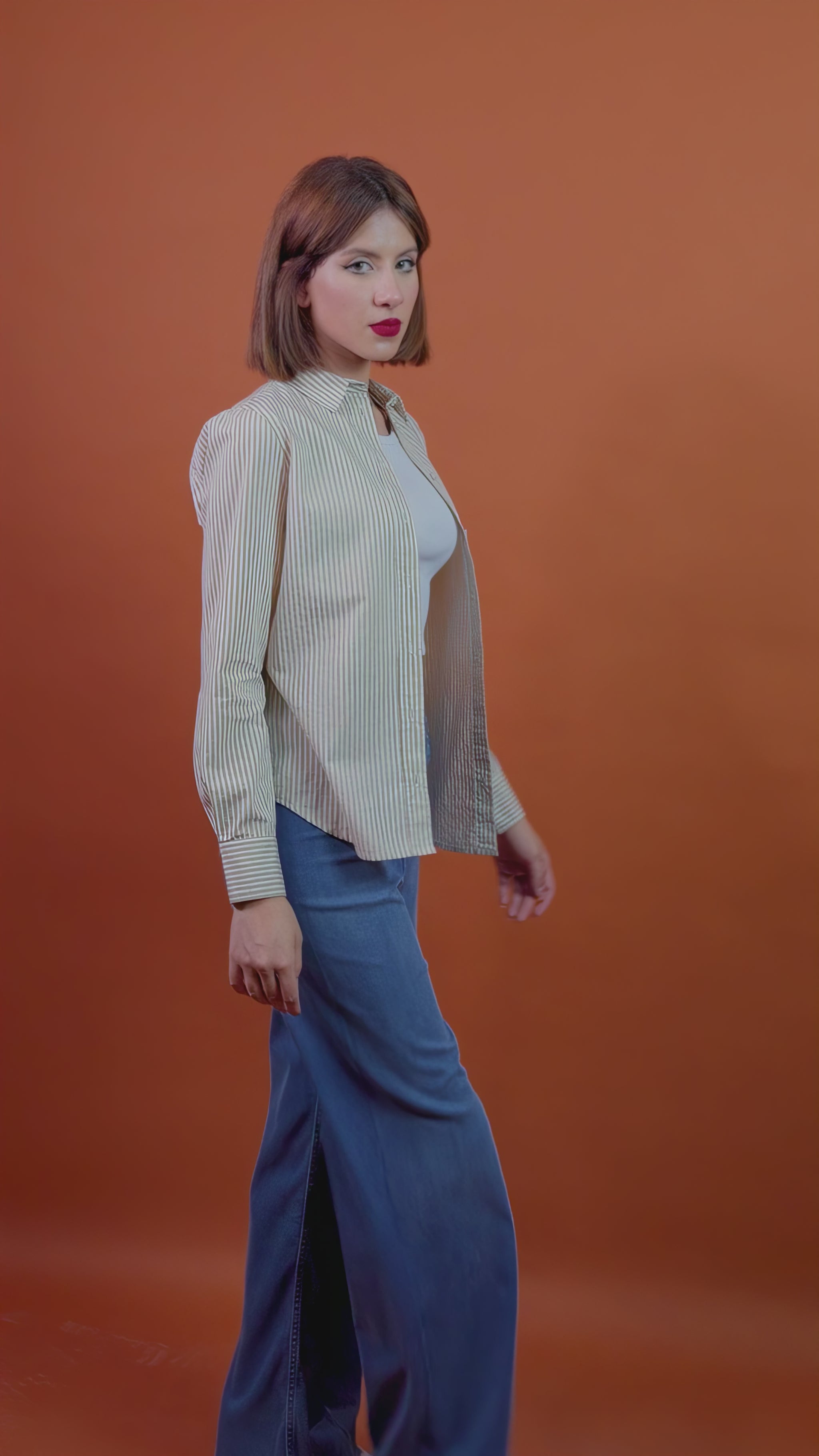 La chemise TWITY écrue à rayures marron, à porter de façon classique ou de façon plus branchée ouverte sur un t-shirt.