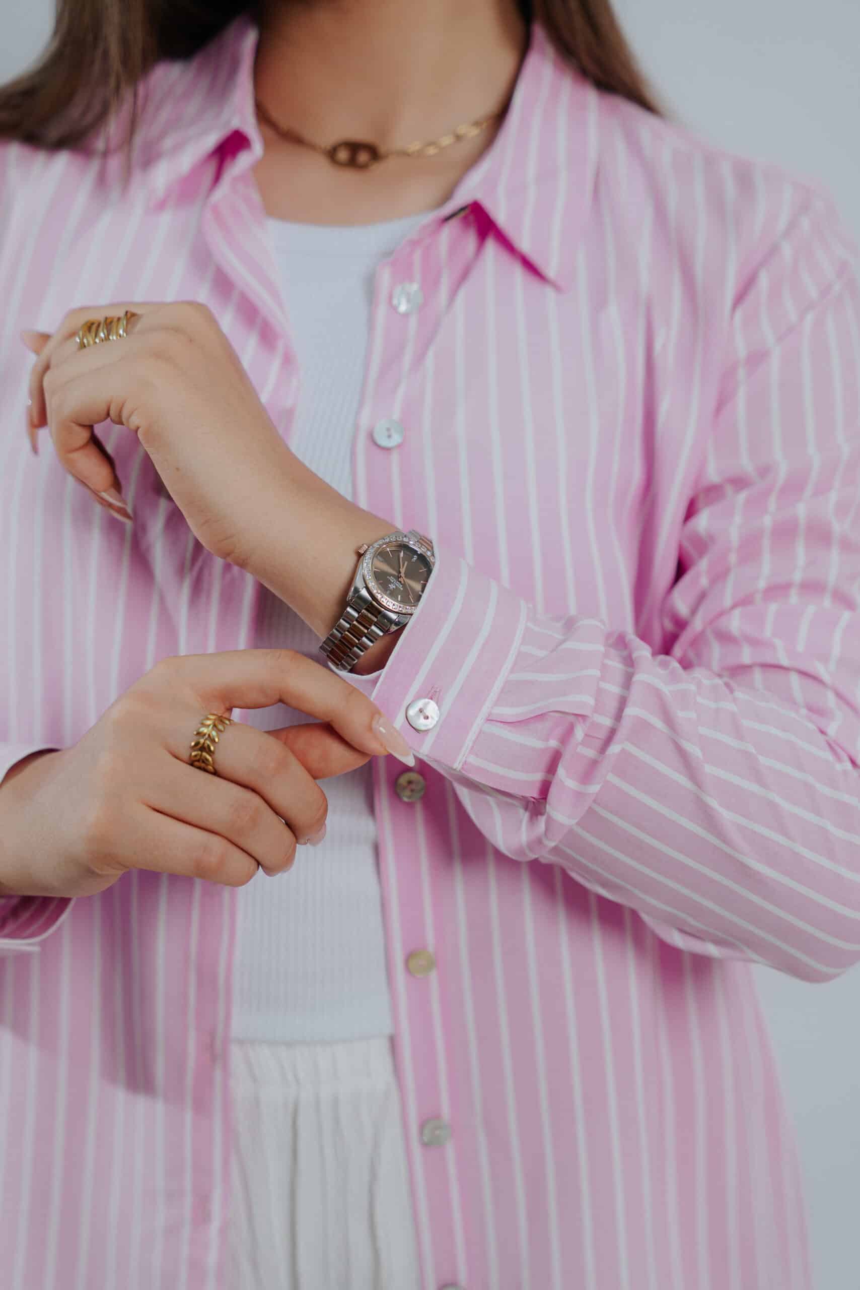 La chemise rayée s’installe dans un vestiaire formel et intemporel rose claire sur fond blanc, elle présente une empiècement dos contrastée qui bouscule le graphisme.