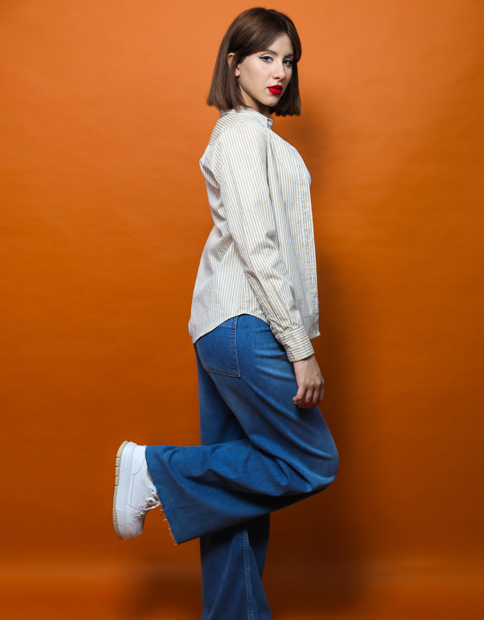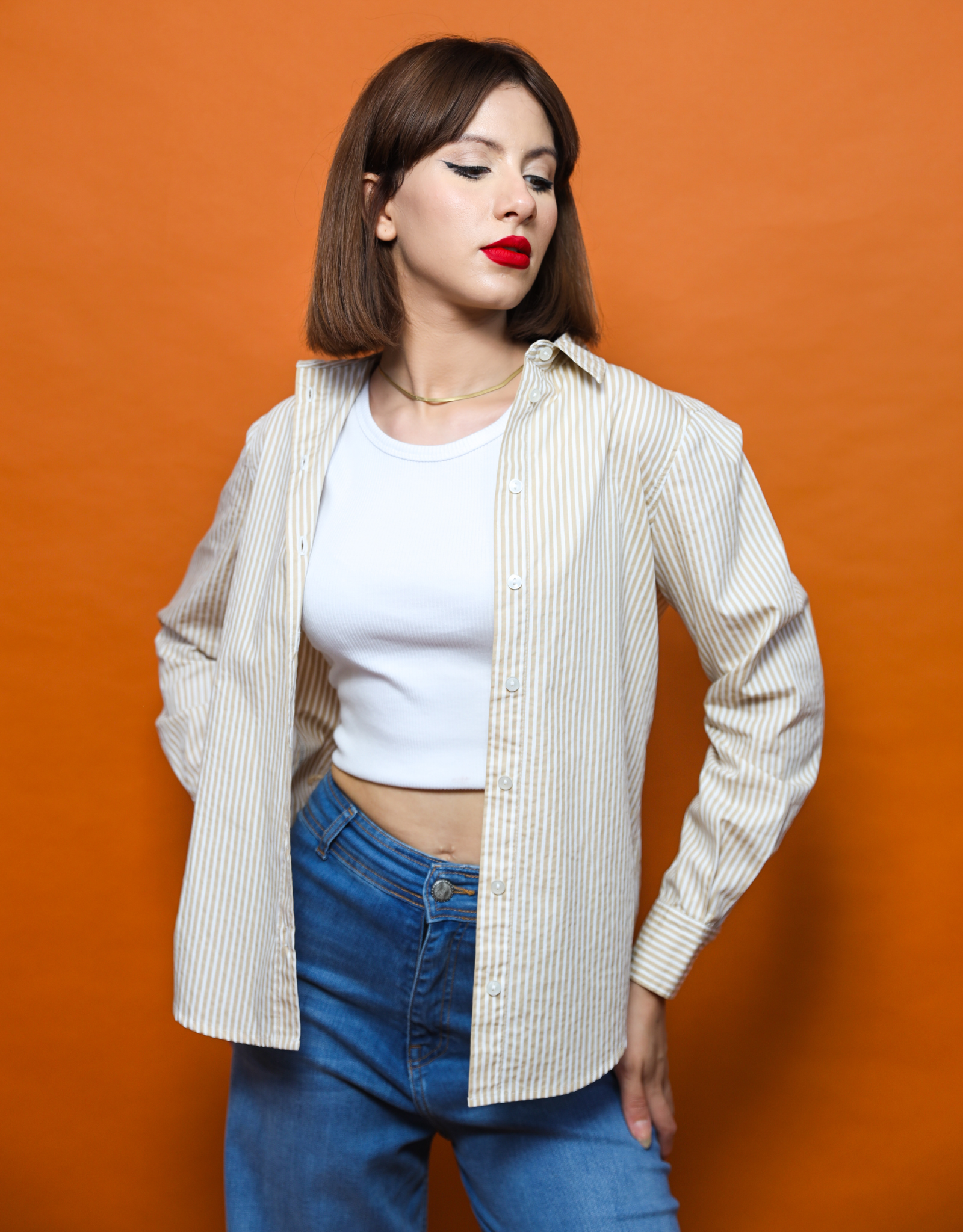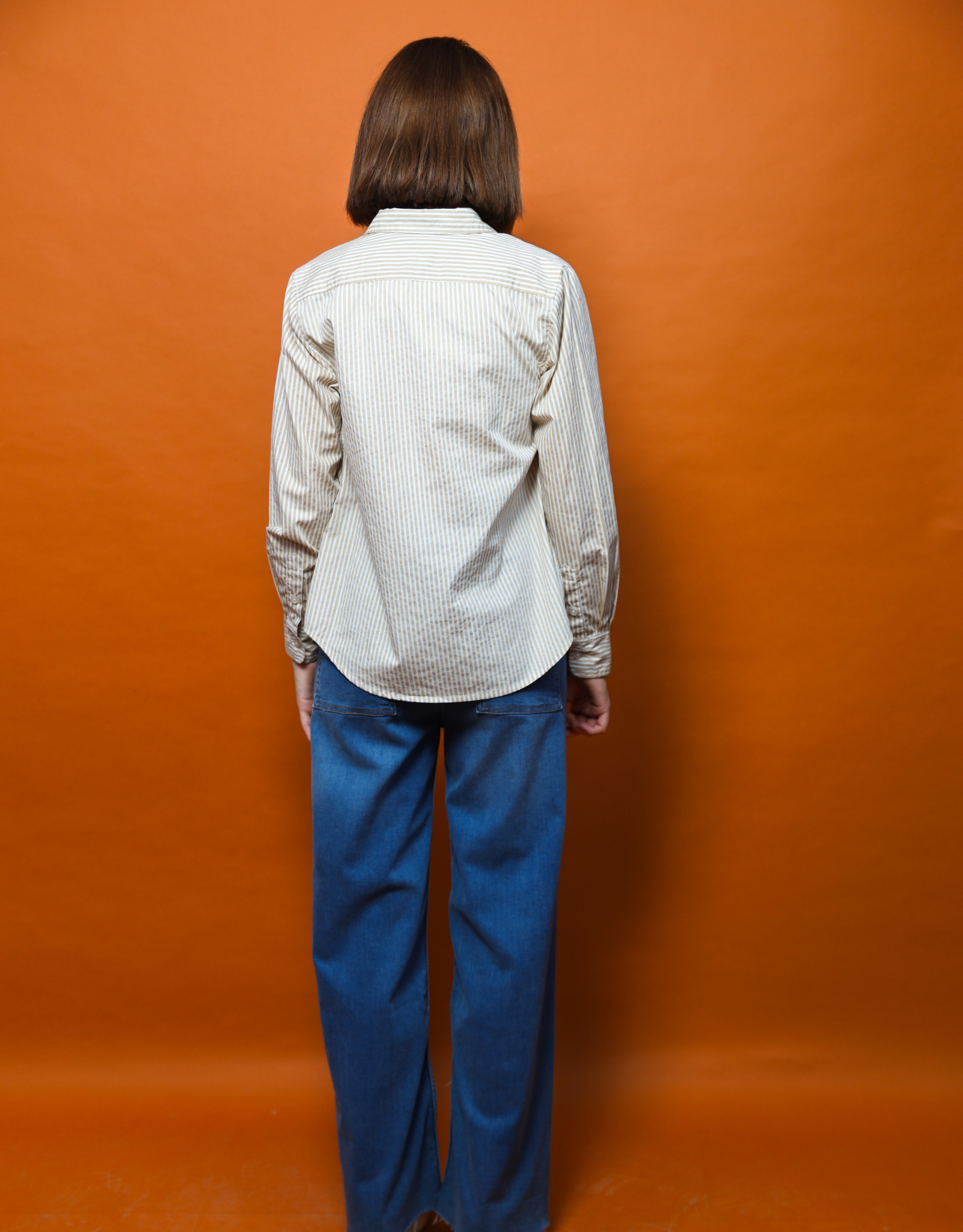 La chemise TWITY écrue à rayures marron, à porter de façon classique ou de façon plus branchée ouverte sur un t-shirt.